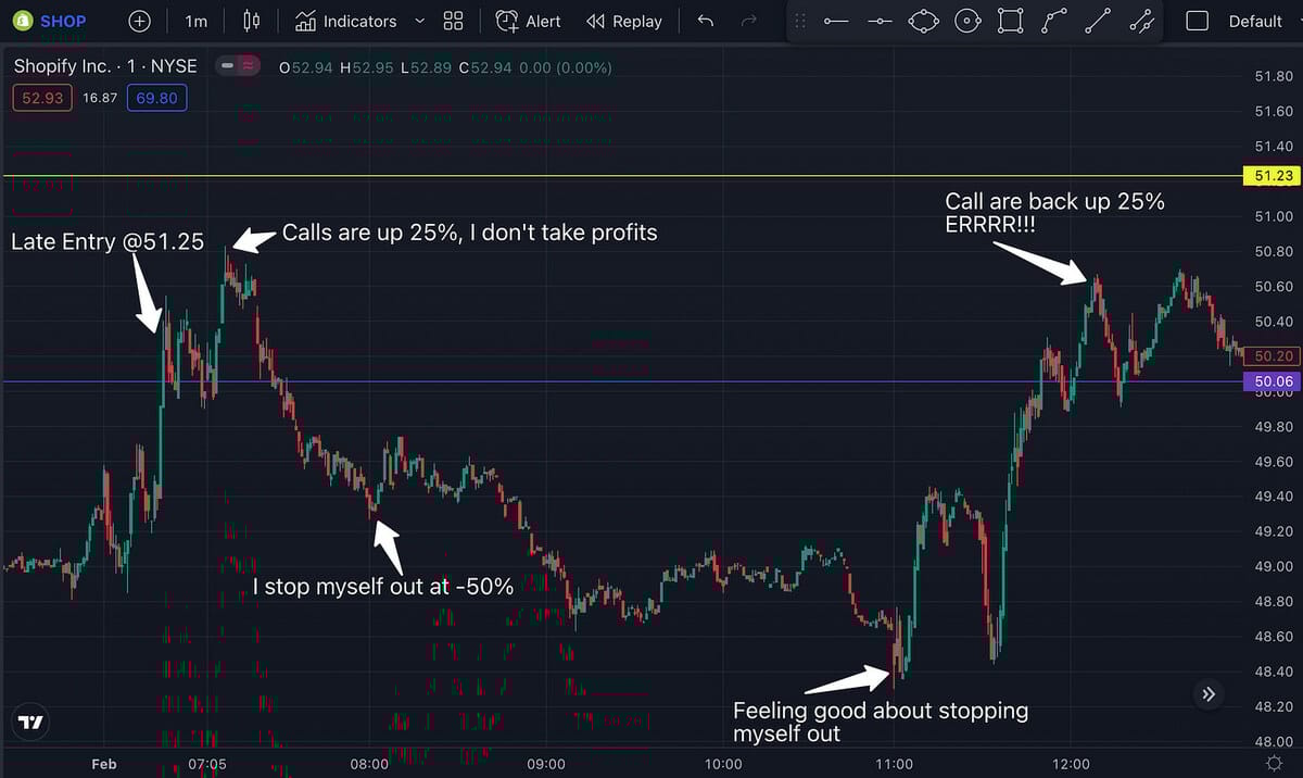 But, the market reverses as does SHOP. It looks like things are going higher. Shoot, what do I do? Do I go back in at the 50 price break again? Do I sit it out? What do I do? What do I do? I don’t have a trading plan in place for this.